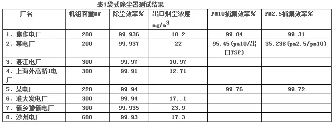 1、表1是8台电除尘器改袋式除尘器、阻力在1000Pa以下的测试结果,效率都在99.91%~99.97之间,出口排放浓度都在24mg/m3以下。(测试时依据的旧环保标准)新环保标准下将除尘器阻力设置1000Pa以上时效果会更好。PM10捕集率大于95.45%,PM2.5都在99.31%以上。