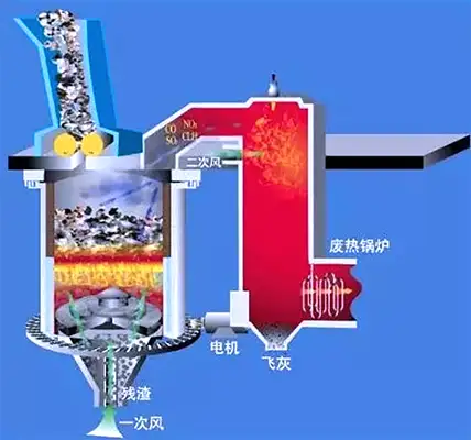在垃圾燃烧炉内喷射还原剂氨水,控制炉内烟气NOX产生浓度;从余热锅炉排出的烟气从半干式脱酸反应塔顶部切向进入,而碱性吸收剂则从旋转雾化器内以雾滴的形式高速喷出,使烟气中的酸性气体(如HCL、SO2等)绝大部分被碱液吸收去除,烟气的余热则使浆液的水分蒸发,反应生成物以干态固体的形式排出。